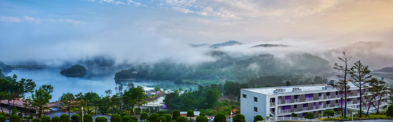 그래도 뷰는 저수지 보이고...(아침에는 안개로 아무것도 안 보였음.)